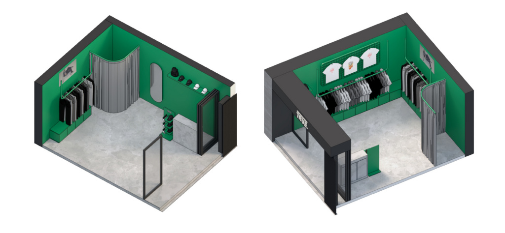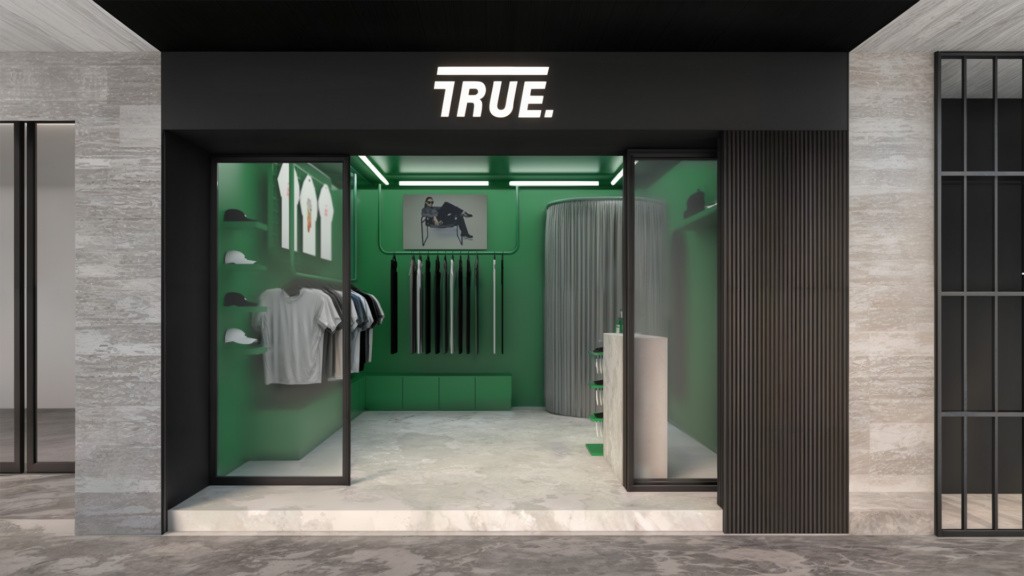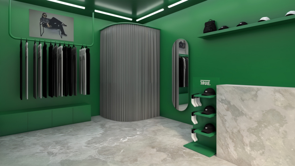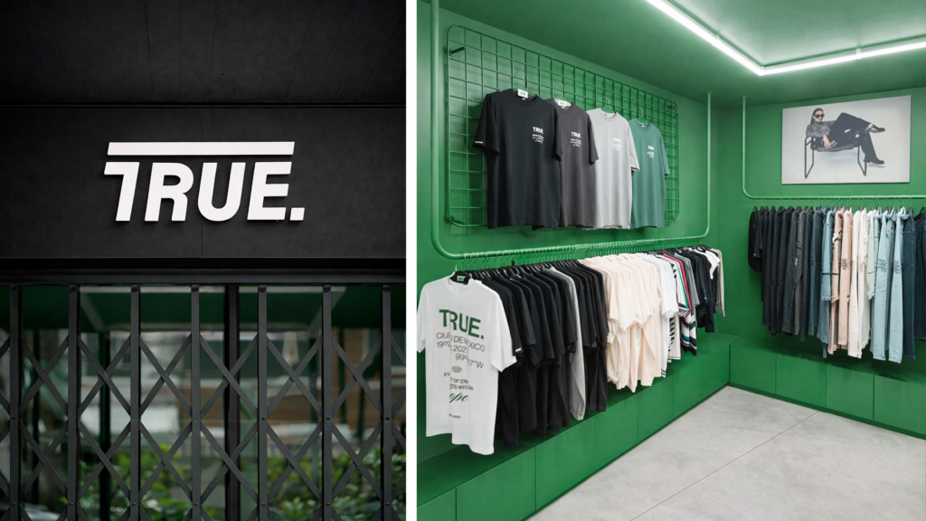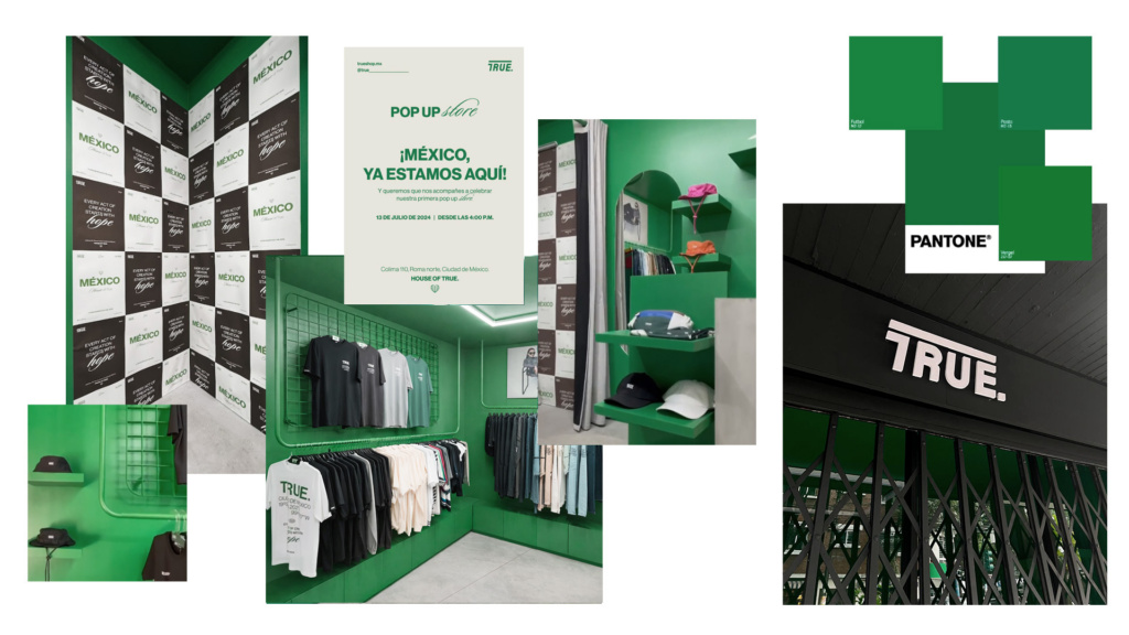 La pop-up de TRUE en Ciudad de México se desarrolla a partir de una premisa clara: una tienda vitrina. Debido a la escala compacta del local, el proyecto se plantea como un espacio altamente visible desde la calle, donde el interior actúa casi como un escaparate continuo para la marca y sus productos.