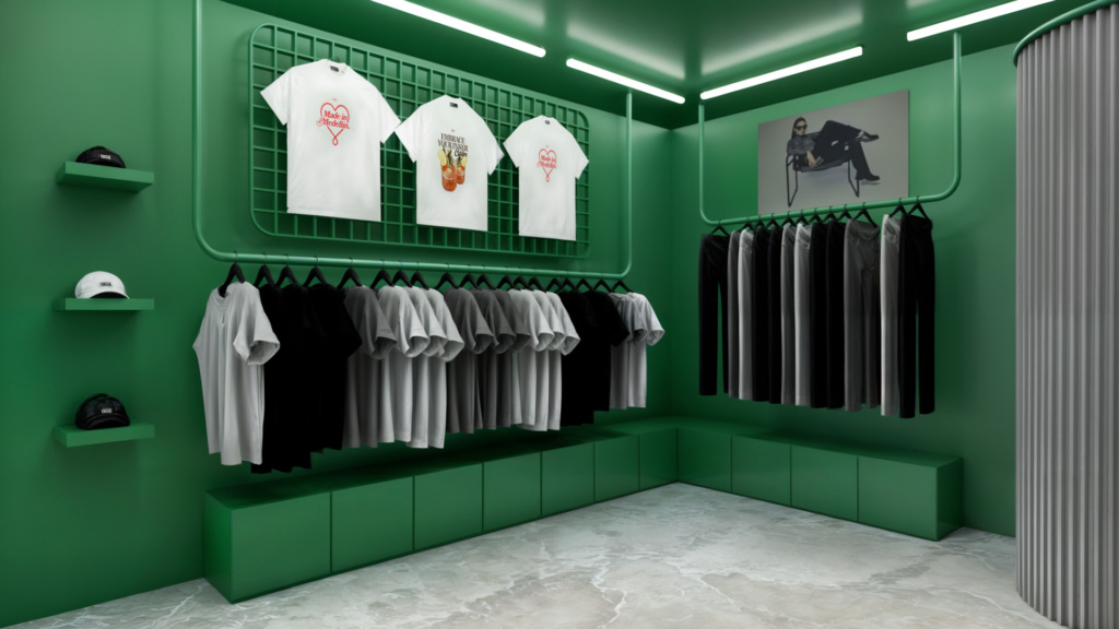 El local había funcionado anteriormente como una galería de arte, una condición que influyó en la manera de plantear el interior. La propuesta retoma esa lógica expositiva para crear un ambiente limpio y directo, donde las prendas se perciben casi como piezas en exhibición y donde el espacio permite entender rápidamente la colección desde el exterior.