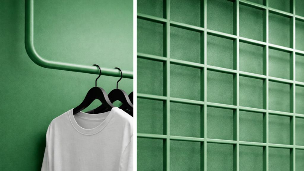 A partir de esta idea, el interior se construye a partir de un gesto cromático claro: un verde intenso que envuelve completamente el espacio. Muros, mobiliario y estructura comparten el mismo tono, generando una atmósfera continua que amplifica la presencia de la tienda y la hace fácilmente reconocible desde la calle.